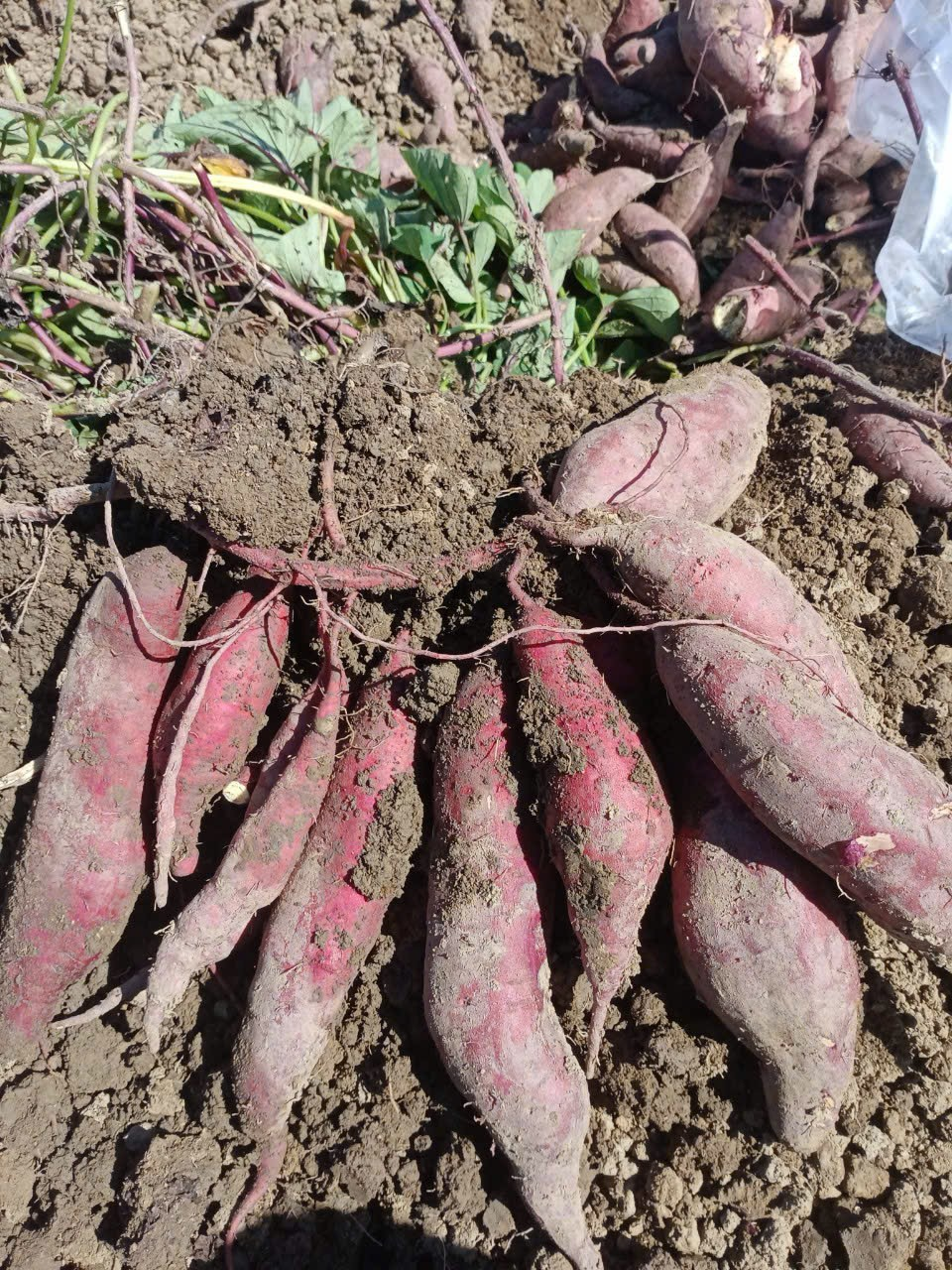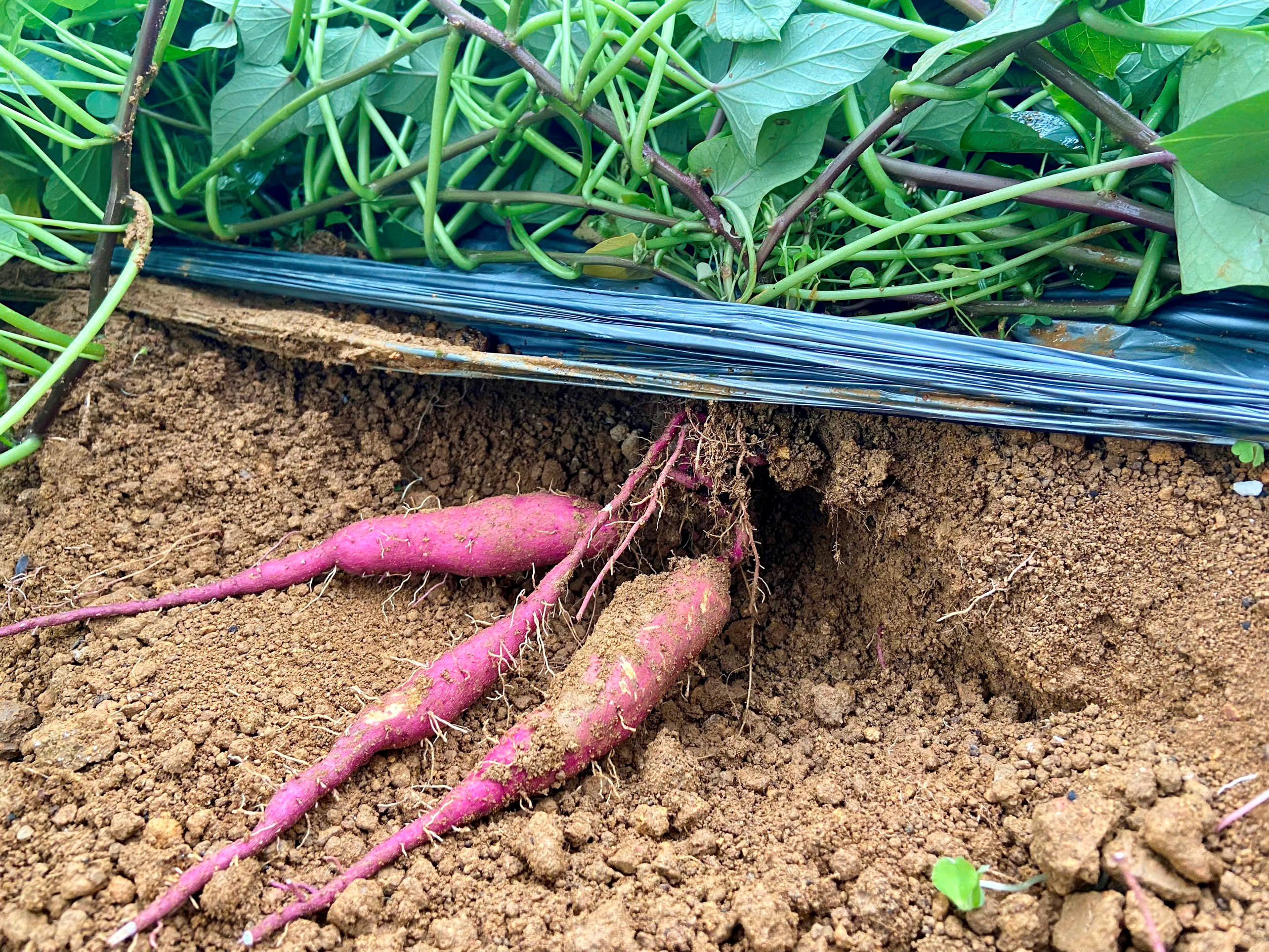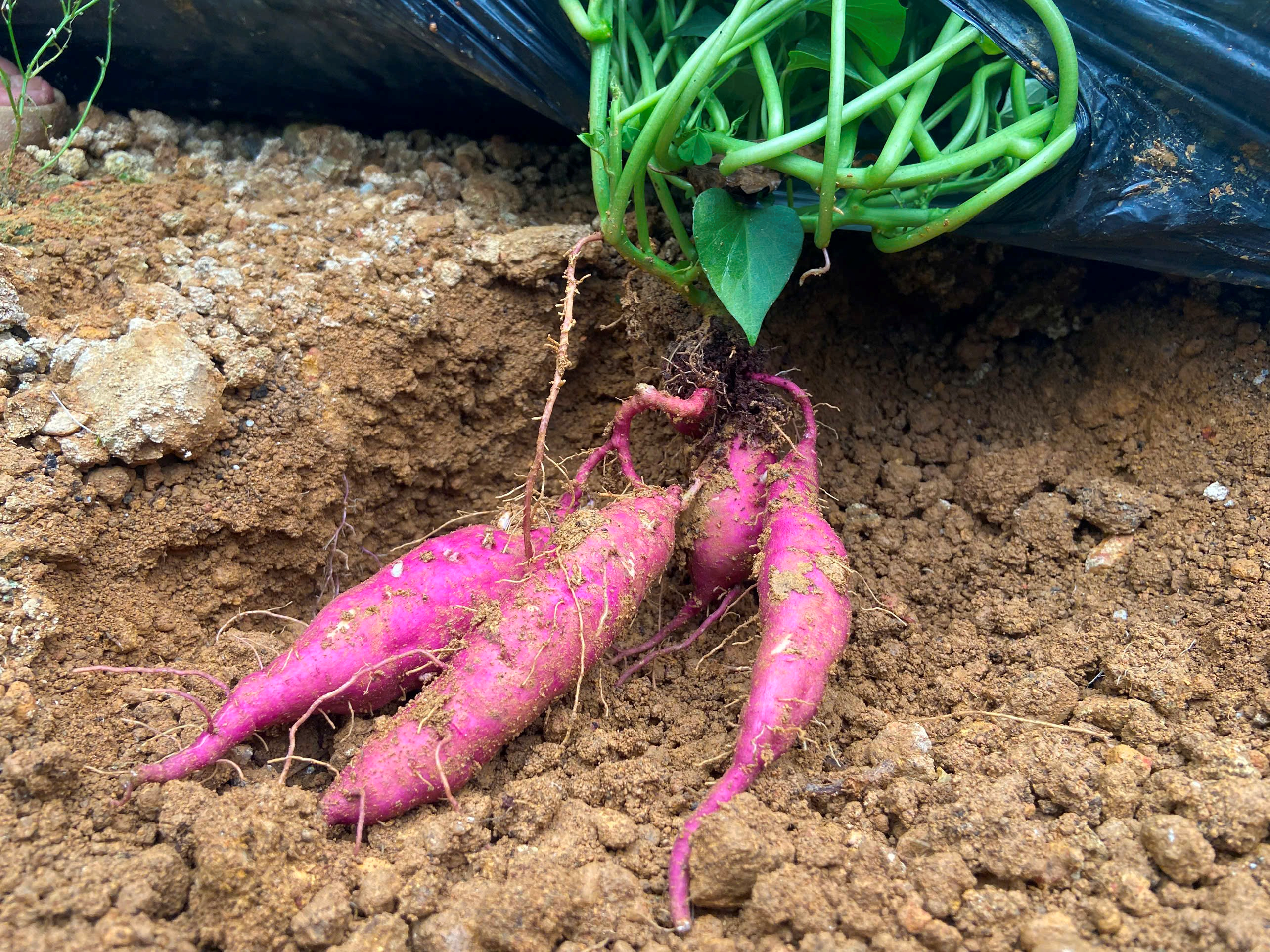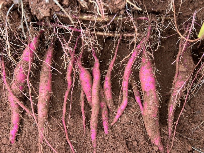 - Vỏ củ có màu đỏ tím, ruột củ màu vàng, dạng củ tròn dài